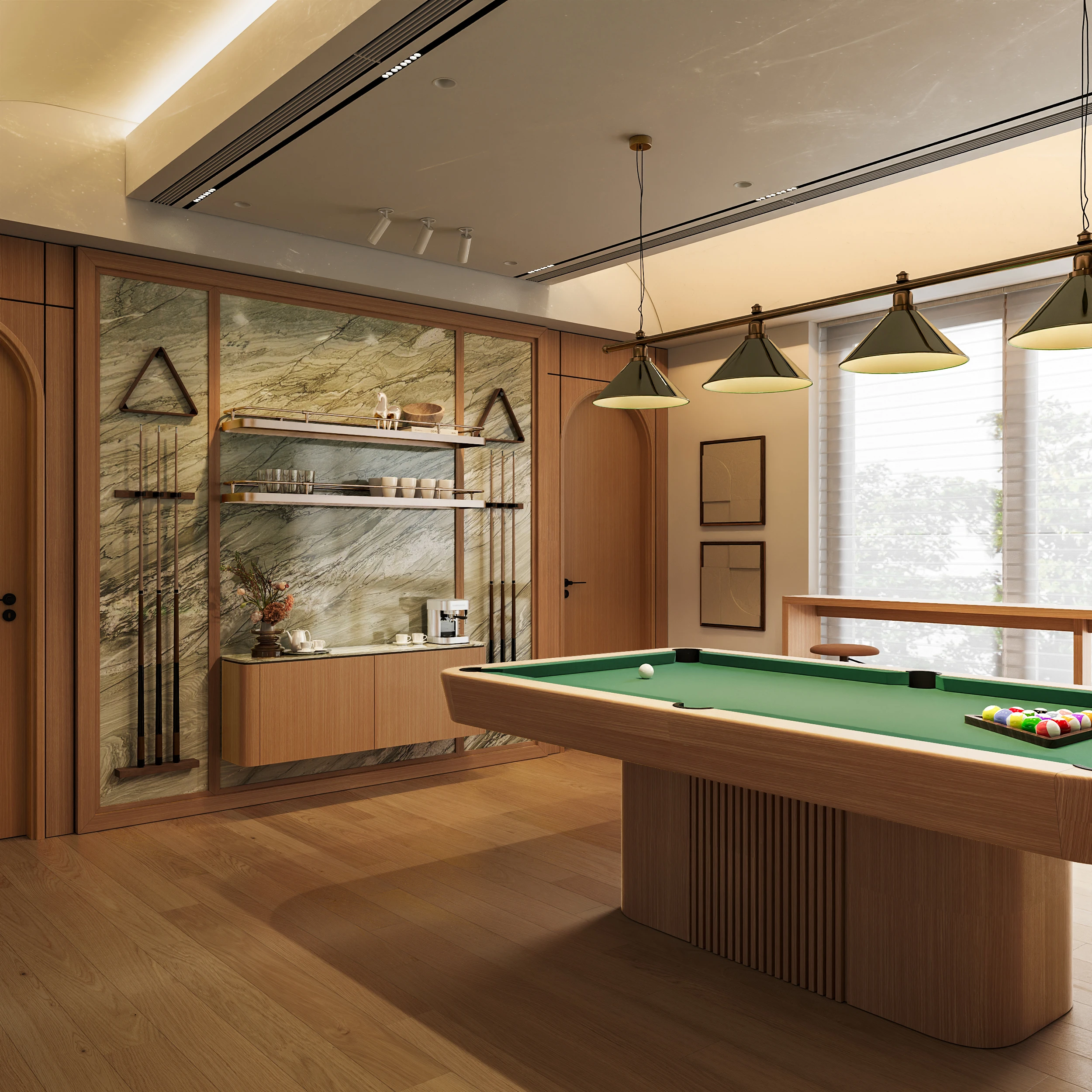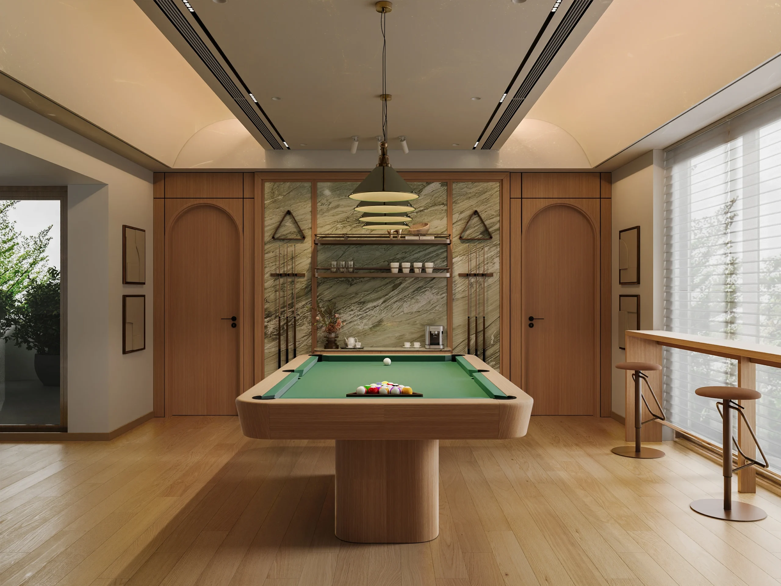 Nội thất trong nhà là sự kết hợp có tính toán giữa gỗ công nghiệp bền bỉ và gỗ tự nhiên cho các món đồ rời, tạo nên sự tương phản bề mặt thú vị. Tông màu gỗ sáng kết hợp cùng sắc trắng chủ đạo, điểm xuyết thêm sắc xanh phong thủy theo sở thích riêng của nữ gia chủ, tạo nên một tổng thể hài hòa và tràn đầy năng lượng.