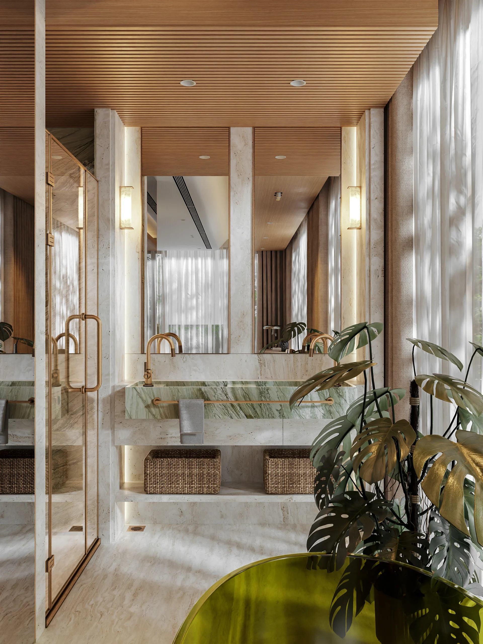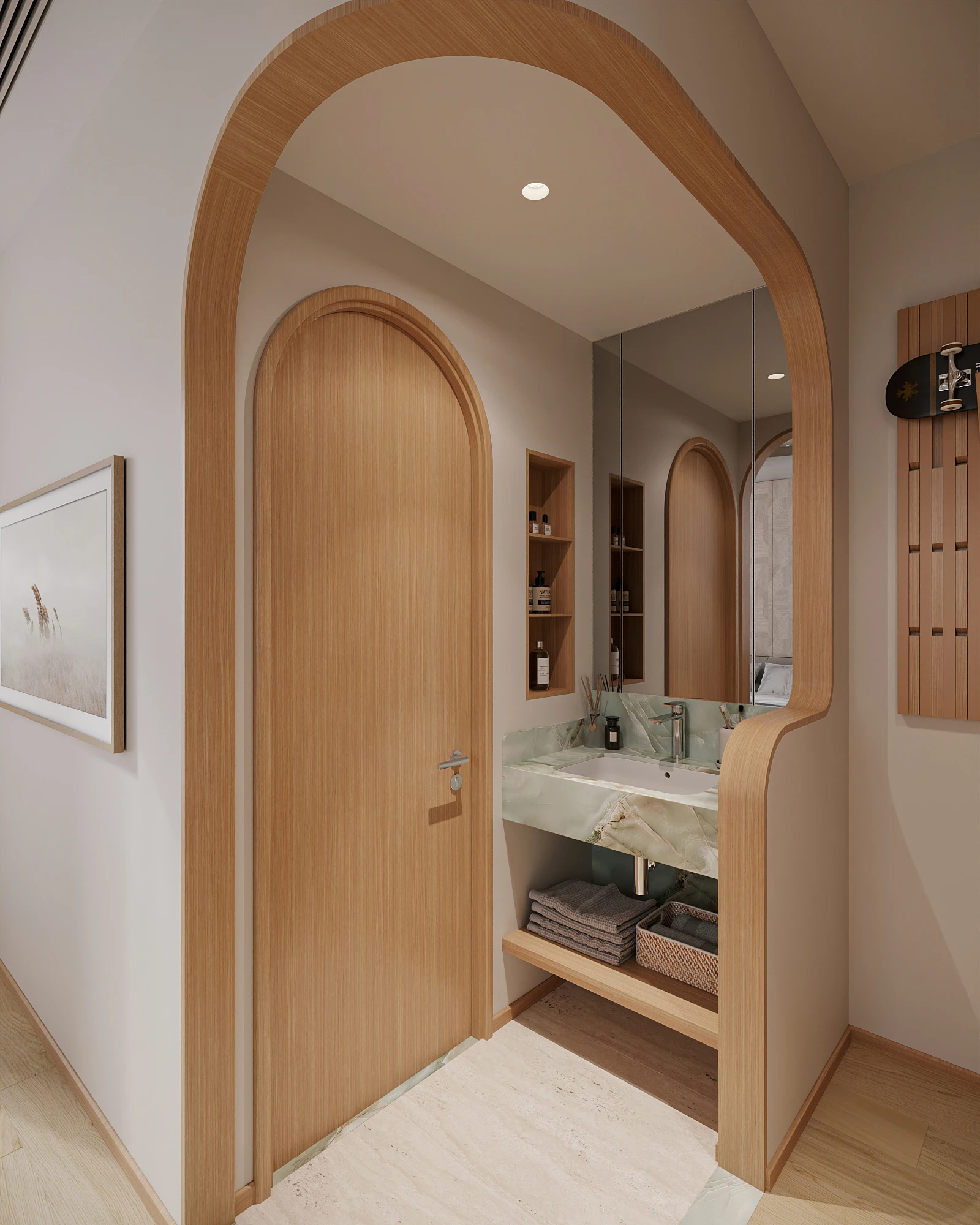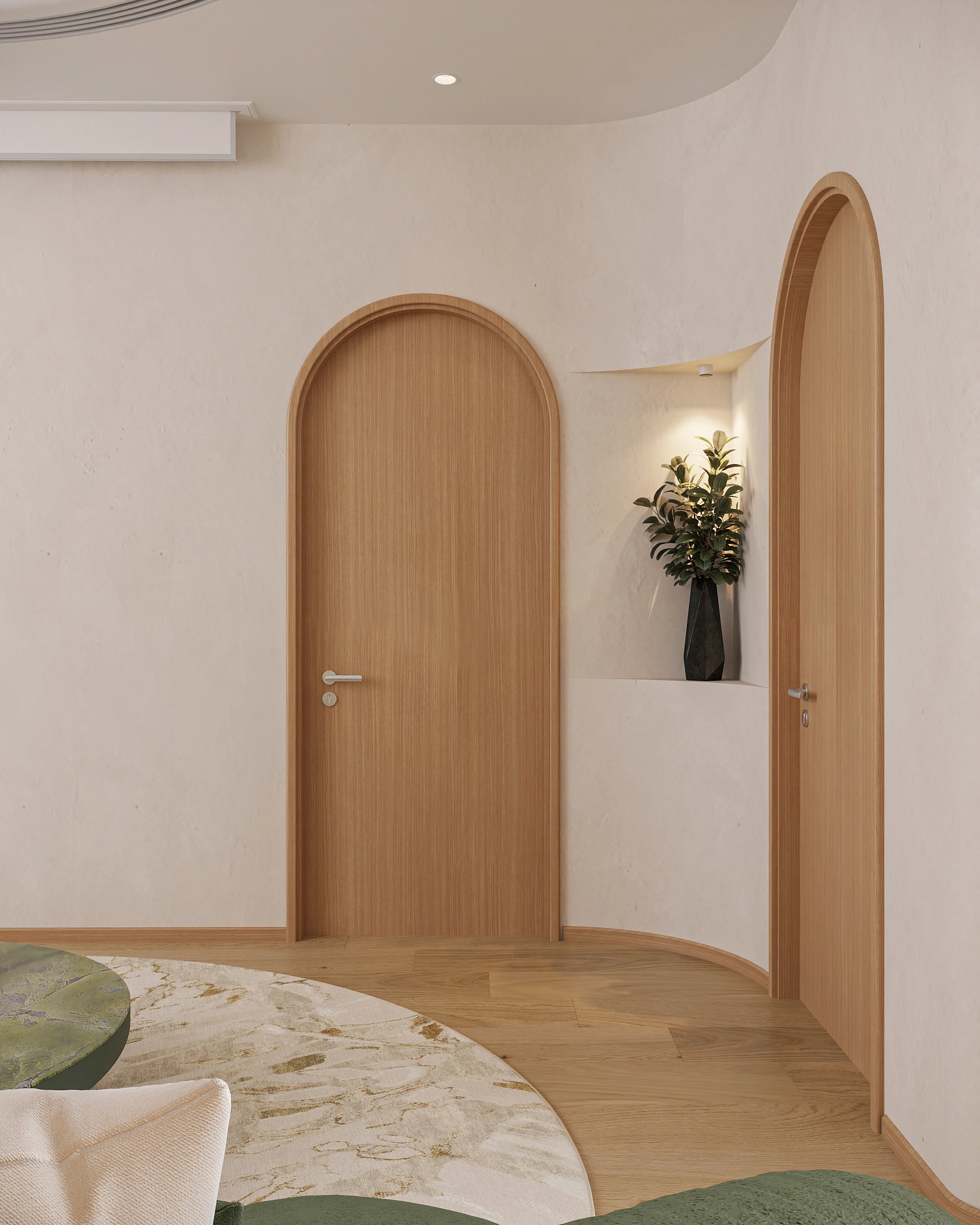 Thay vì những góc cạnh khô cứng, chúng tôi ưu tiên những hệ cửa vòm kính khổ lớn. Việc thay thế gỗ tự nhiên bằng nhôm sơn giả gỗ cho hệ cửa mặt ngoài là giải pháp kỹ thuật nhằm đảm bảo độ bền trước thời tiết, đồng thời giữ trọn vẻ thẩm mỹ ấm áp.