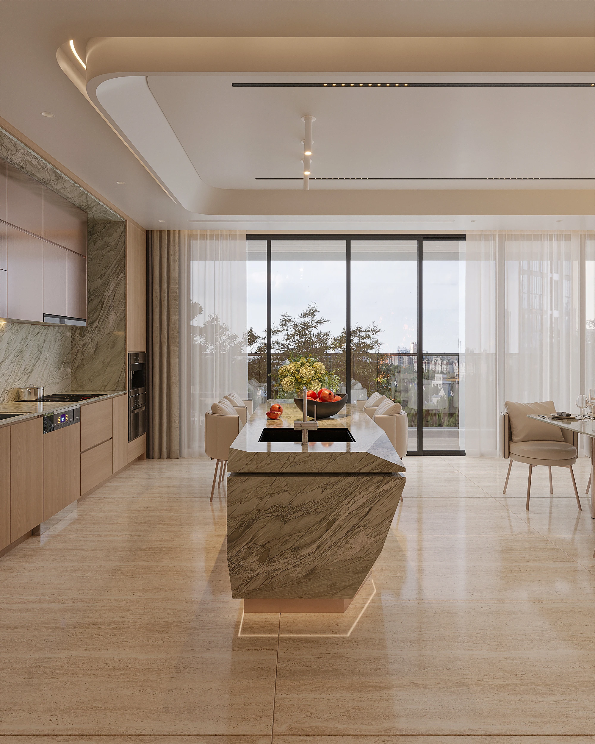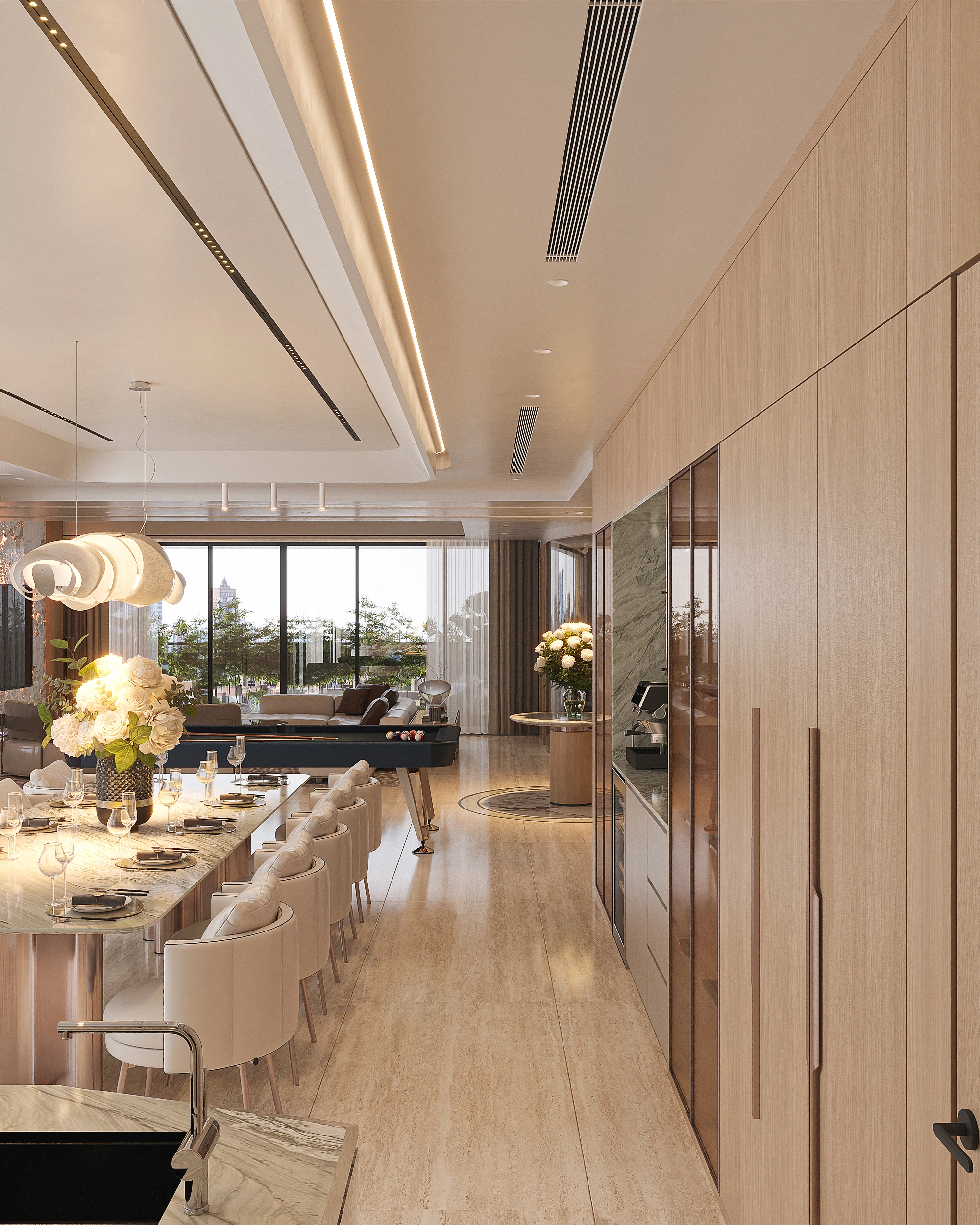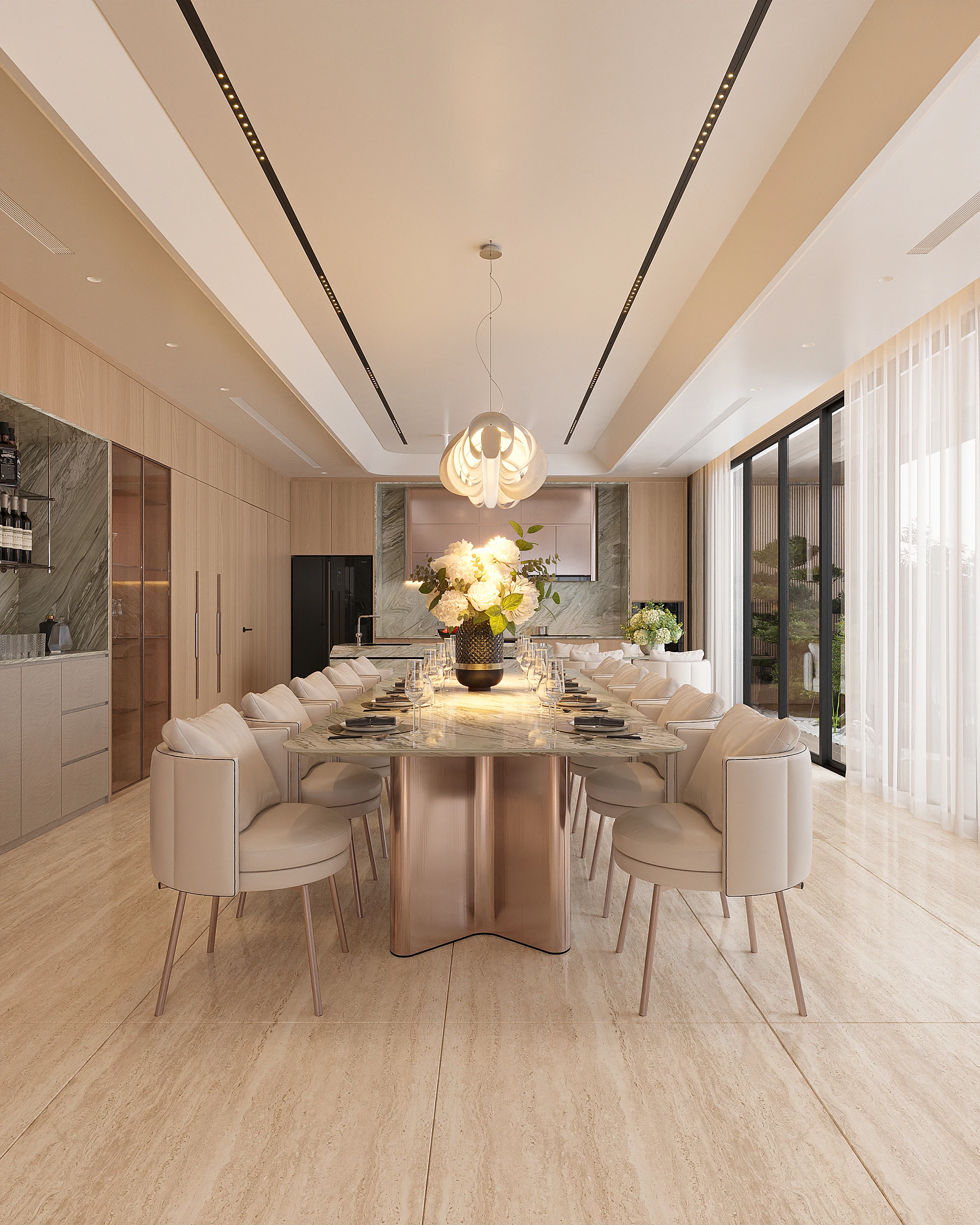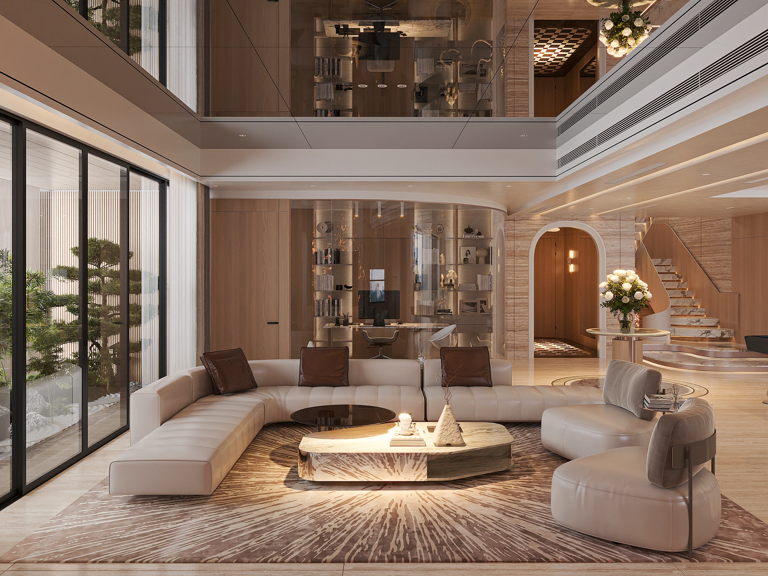Cách phân bổ tỷ lệ giữa khối đặc và khoảng trống, sự lặp lại của vật liệu tự nhiên trong từng phân đoạn không gian, và cách ánh sáng xuyên qua mặt phẳng kính để tạo ra gradient chiếu sáng thay đổi theo giờ trong ngày được vận dụng cùng tinh thần Modern Organic – kiến tạo một không gian khoáng đạt, nuôi dưỡng cảm xúc.