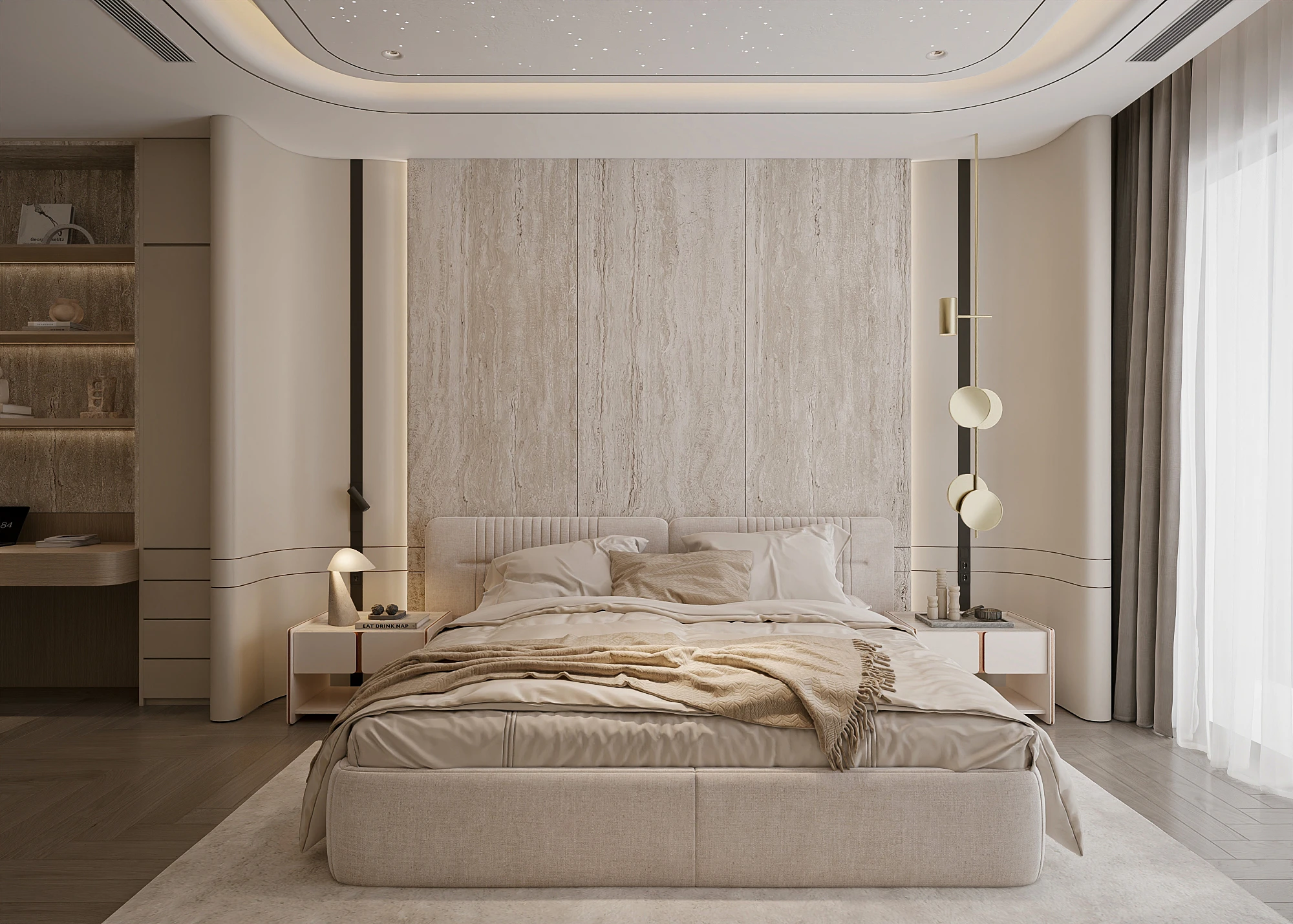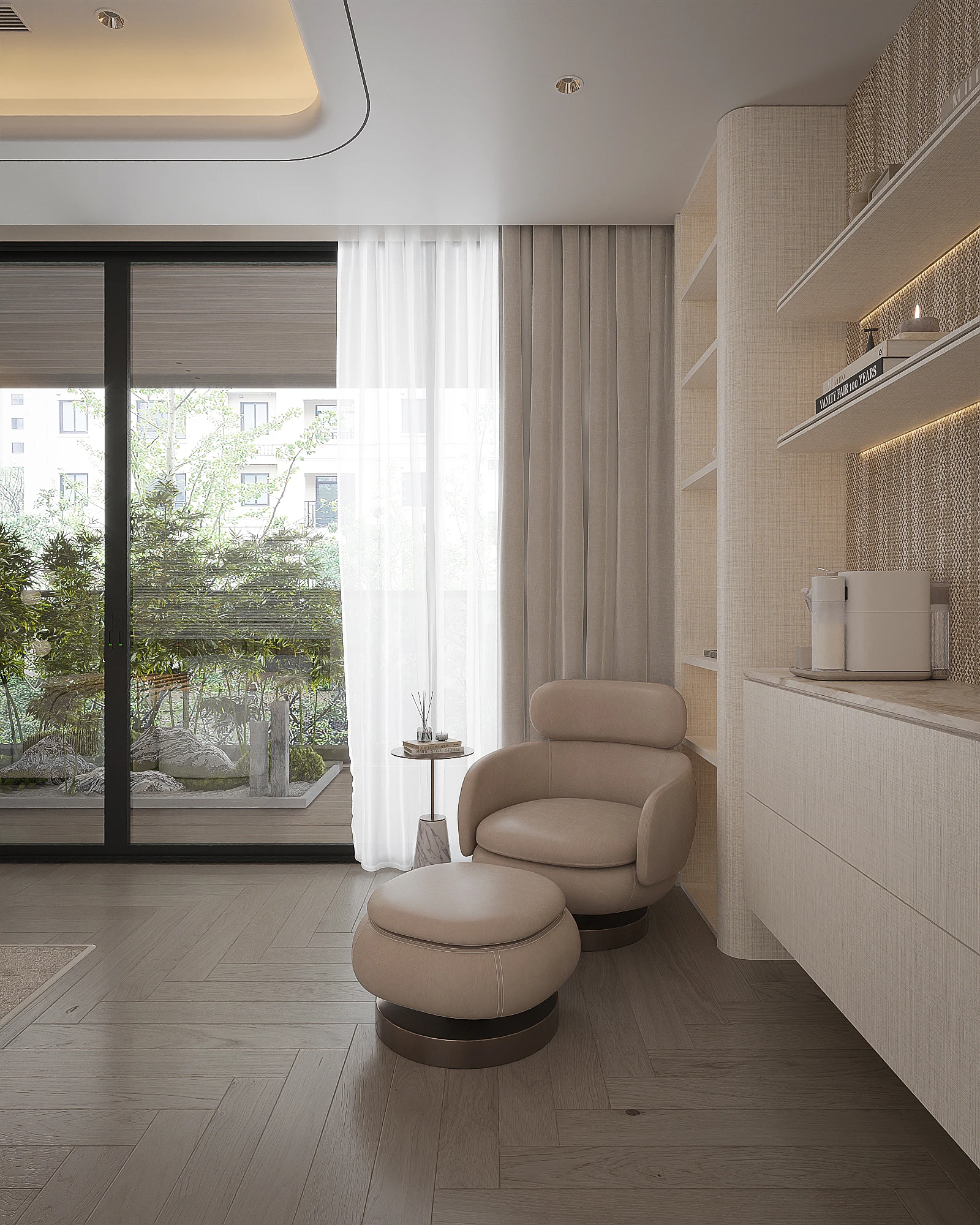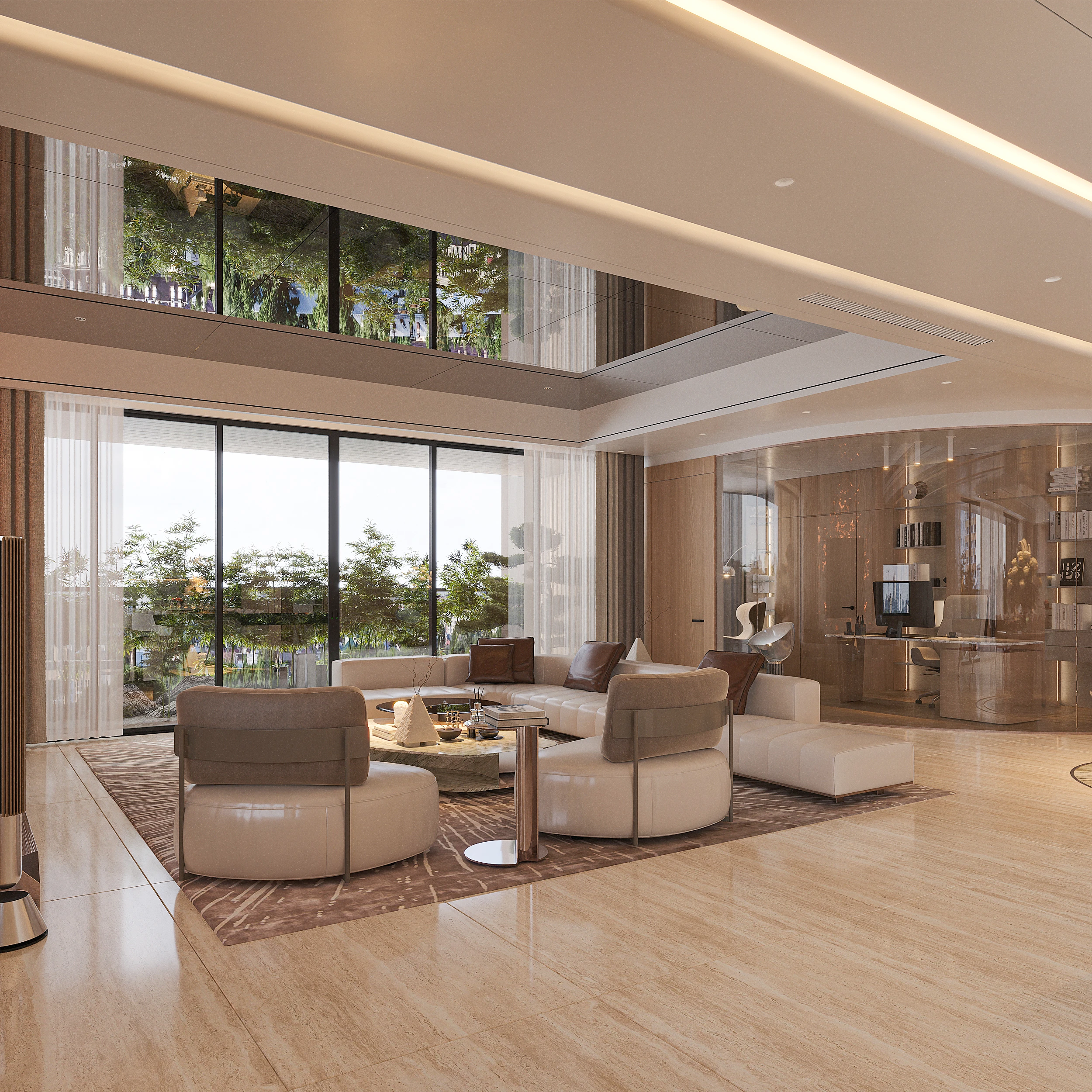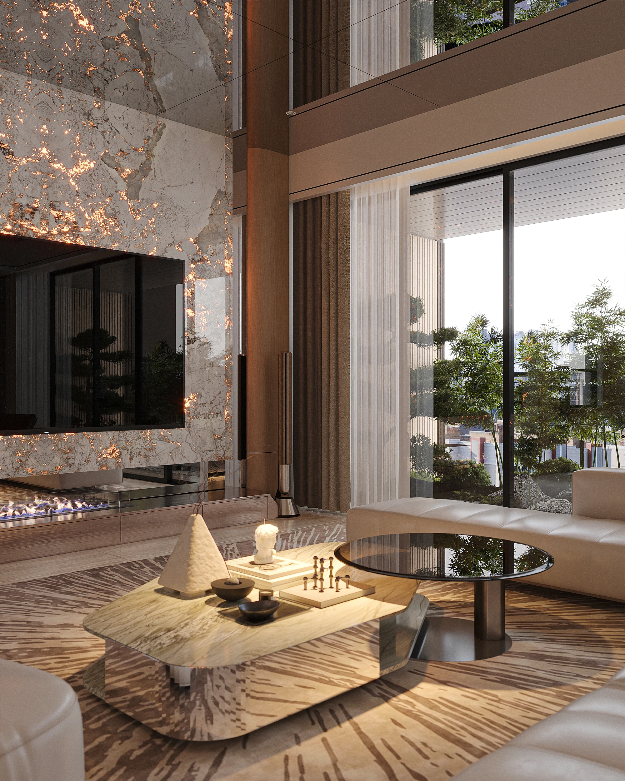 Cách phân bổ tỷ lệ giữa khối đặc và khoảng trống, sự lặp lại của vật liệu tự nhiên trong từng phân đoạn không gian, và cách ánh sáng xuyên qua mặt phẳng kính để tạo ra gradient chiếu sáng thay đổi theo giờ trong ngày được vận dụng cùng tinh thần Modern Organic – kiến tạo một không gian khoáng đạt, nuôi dưỡng cảm xúc.