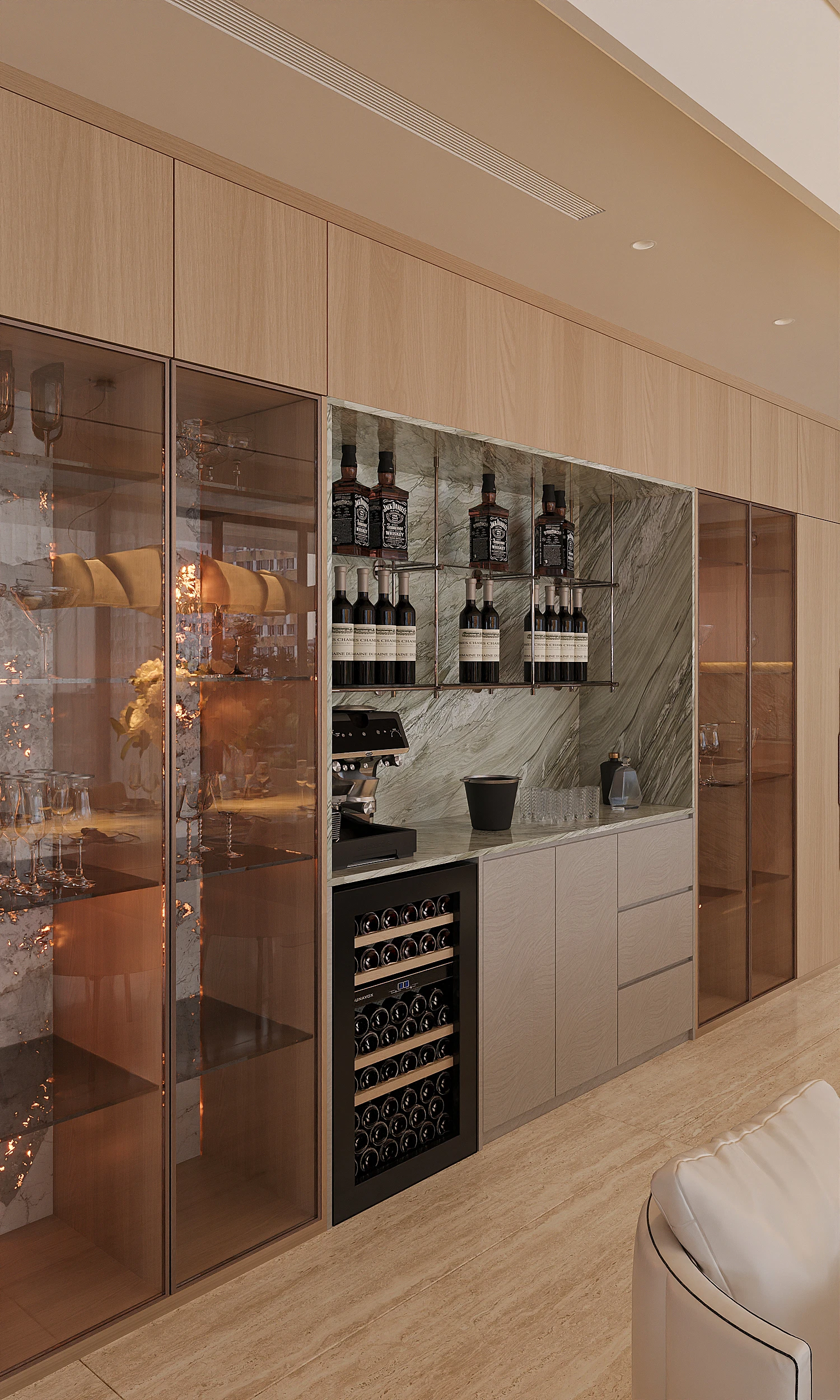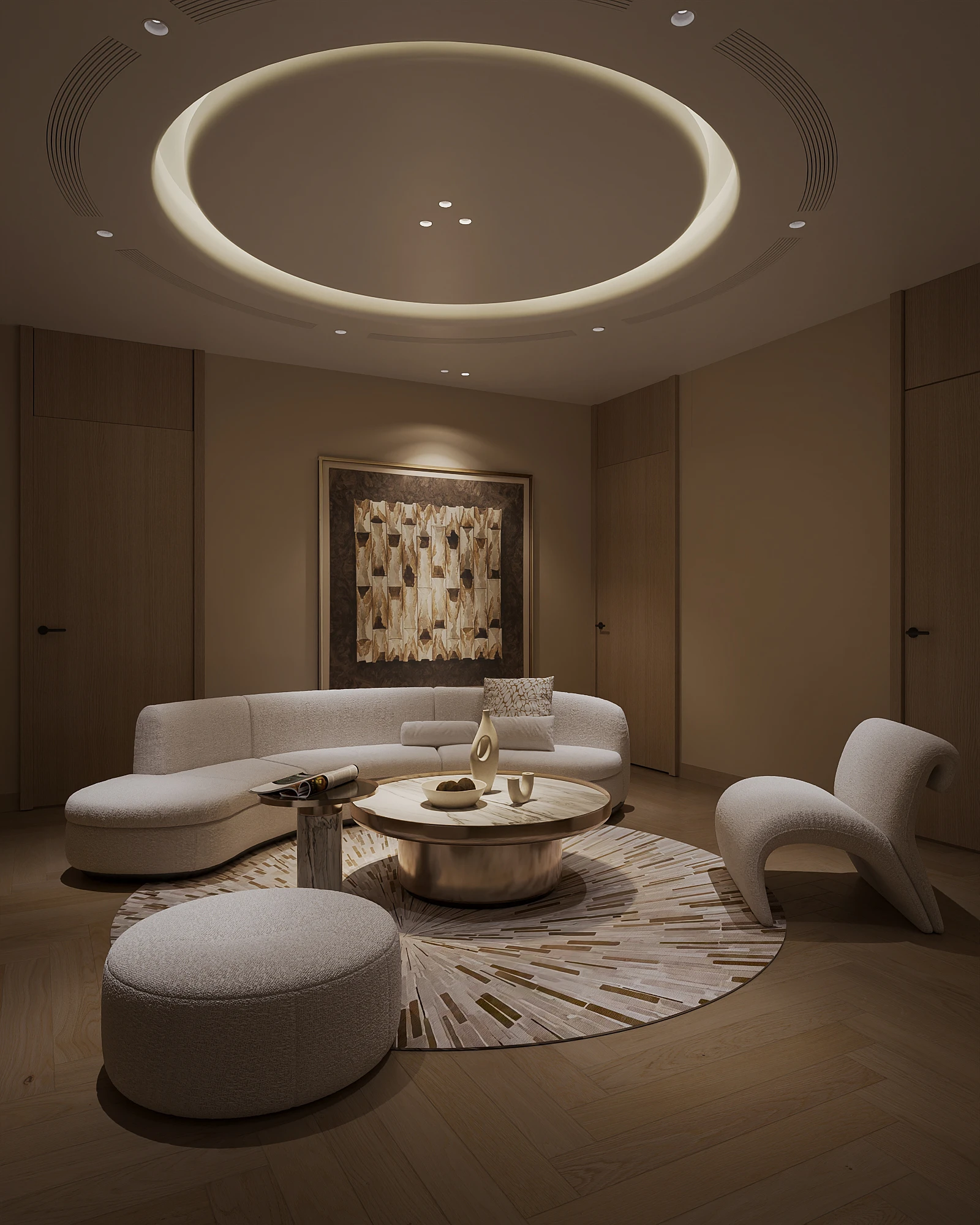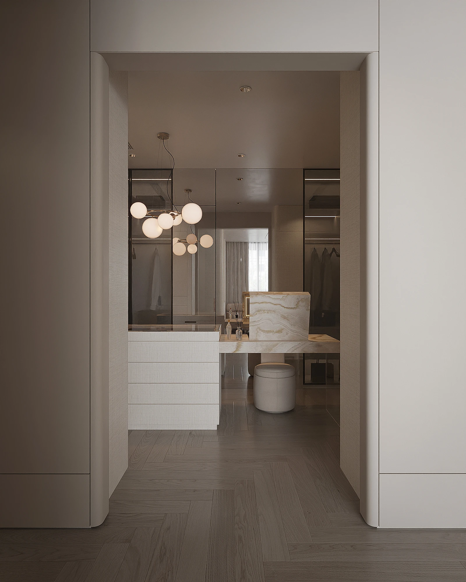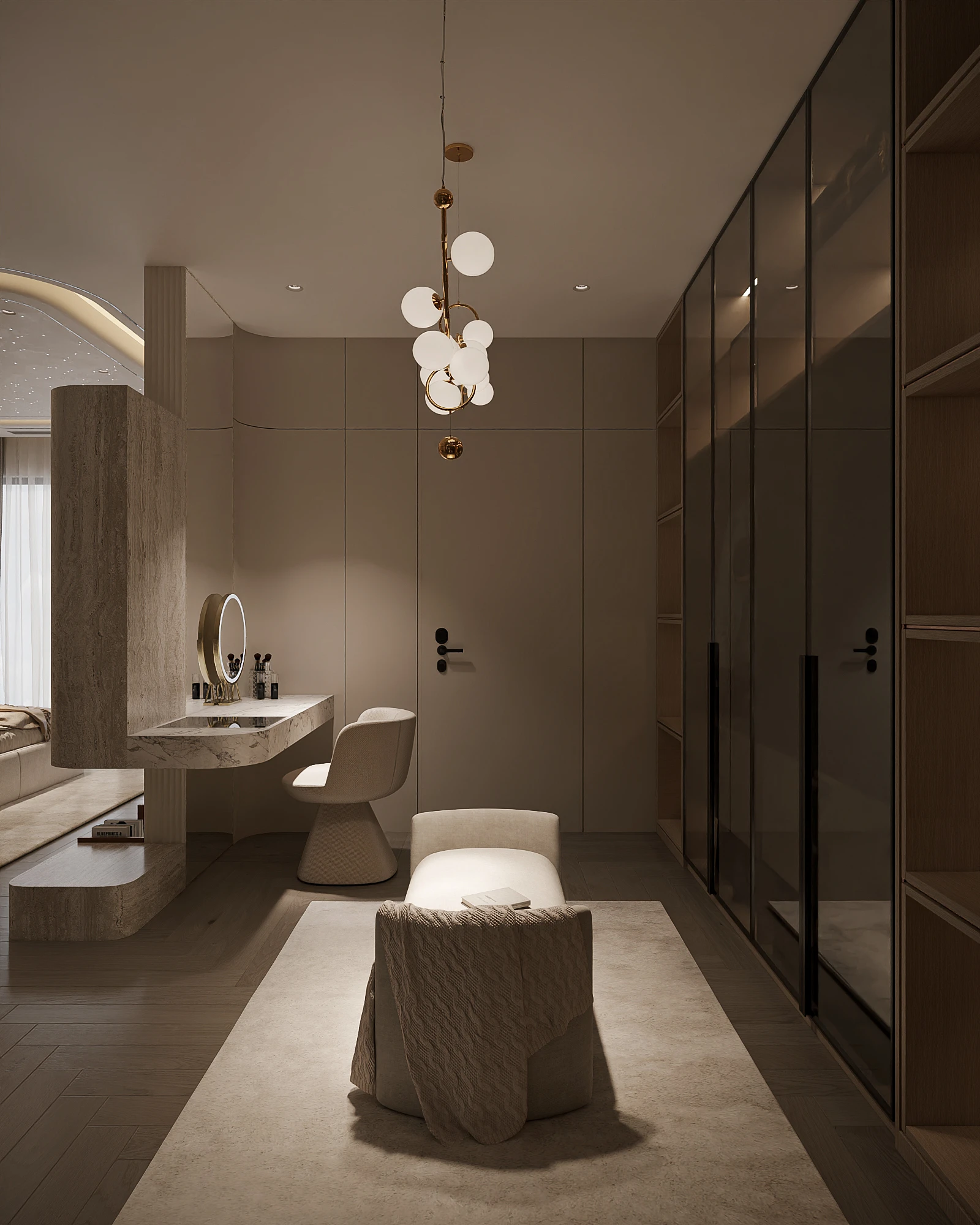 Cách phân bổ tỷ lệ giữa khối đặc và khoảng trống, sự lặp lại của vật liệu tự nhiên trong từng phân đoạn không gian, và cách ánh sáng xuyên qua mặt phẳng kính để tạo ra gradient chiếu sáng thay đổi theo giờ trong ngày được vận dụng cùng tinh thần Modern Organic – kiến tạo một không gian khoáng đạt, nuôi dưỡng cảm xúc.