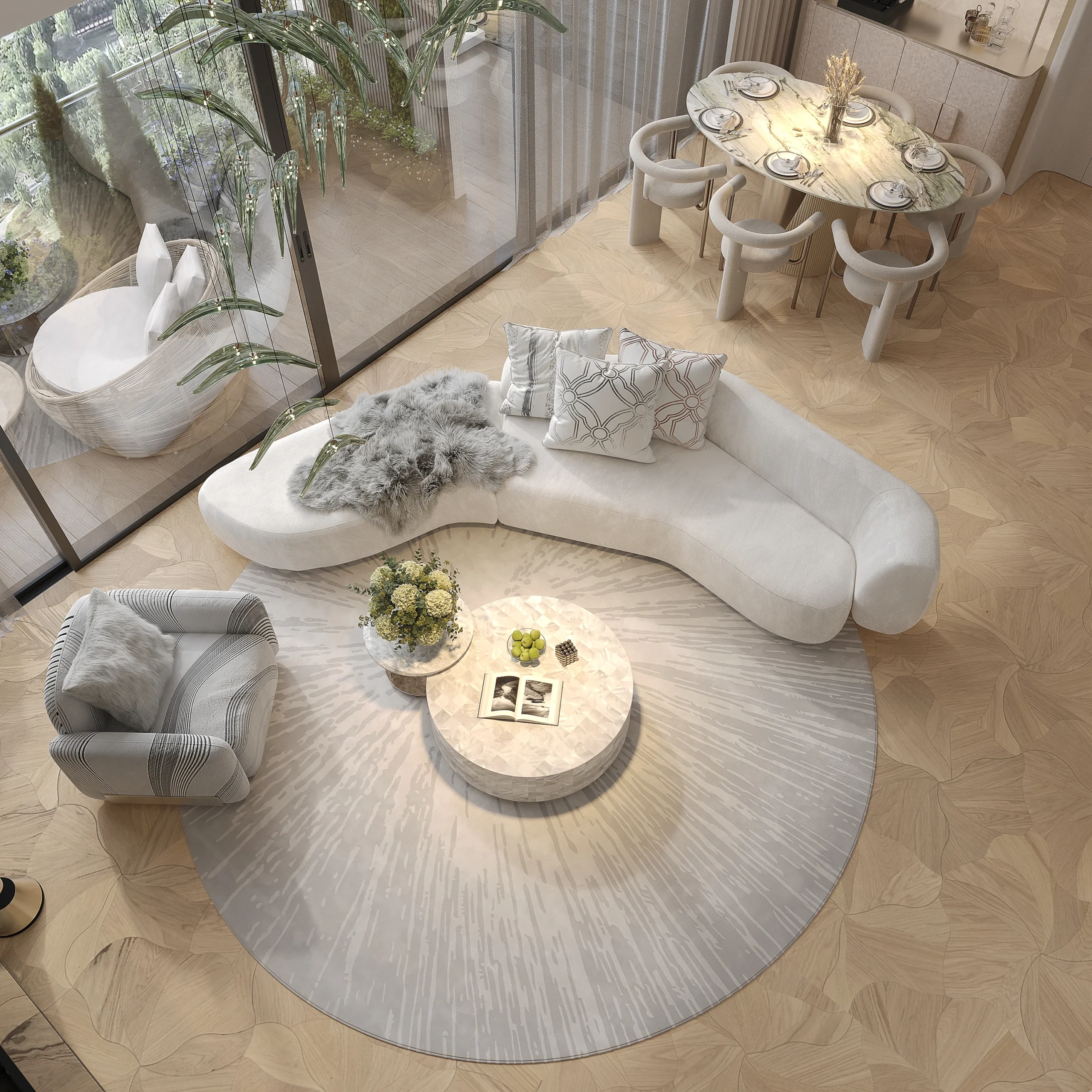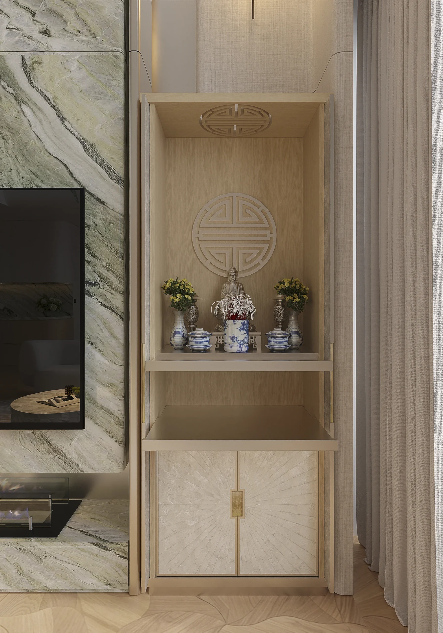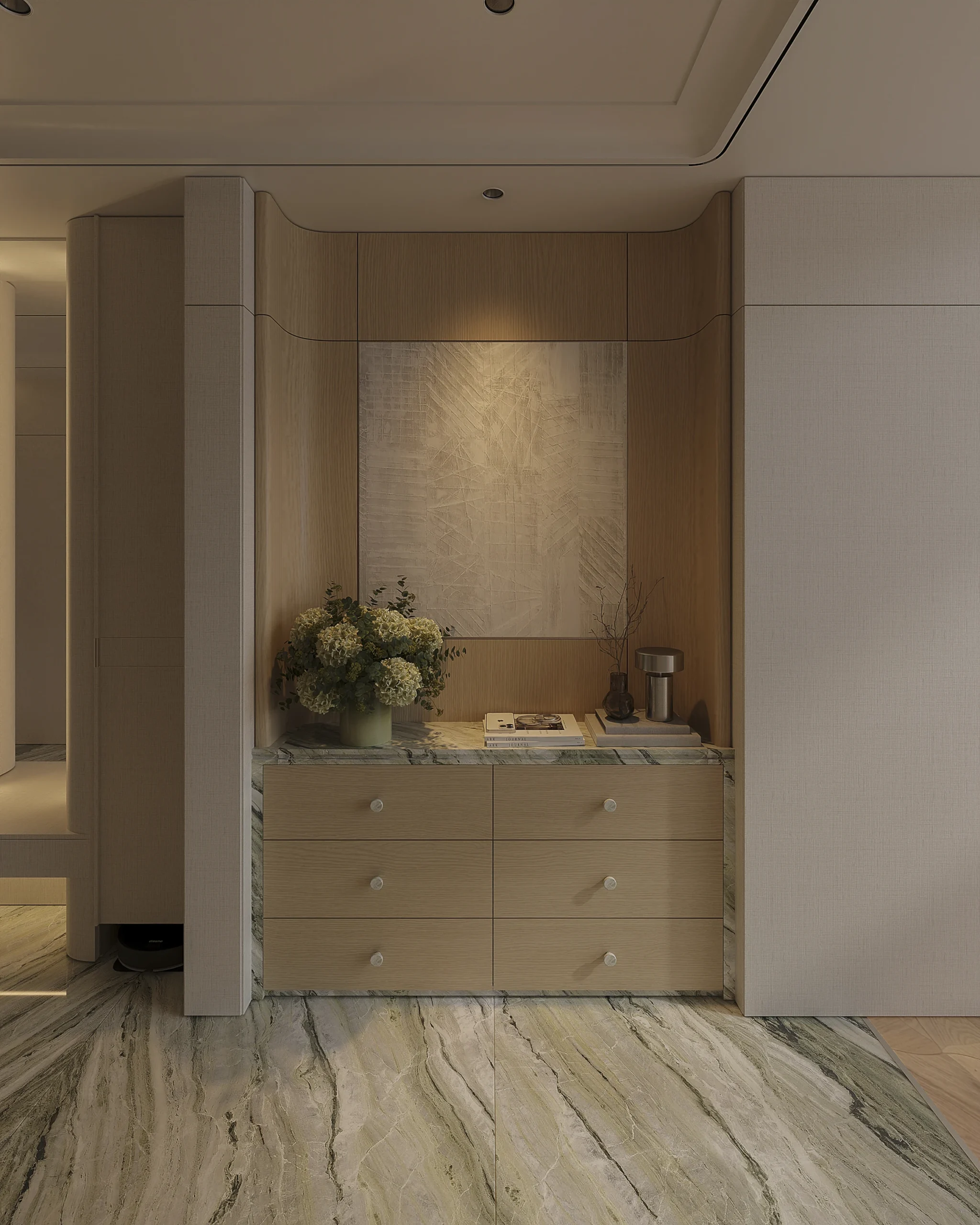 Sự kết nối nằm ở cách vật liệu “giao tiếp” với hành vi thường nhật. Tất cả những đường bo góc triệt tiêu sự sắc cạnh từ nội thất, sắc nền trắng ngà hay điểm nhấn xanh từ các vân đá marble – đều hướng đến tập trung vỗ về cảm giác của những người trực tiếp sinh hoạt bên trong, thay vì cố gắng gây ấn tượng với người chỉ tới ghé chơi.